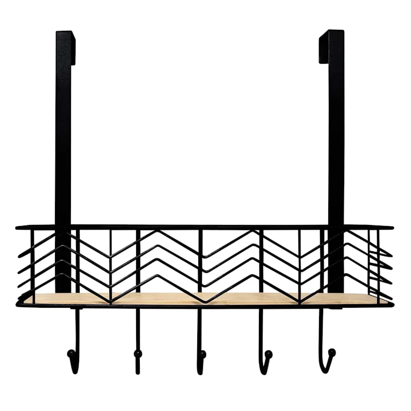 5-Hook Black Chevron Bombay Diamond With Bamboo Wooden Basket Over The Door Hanger
